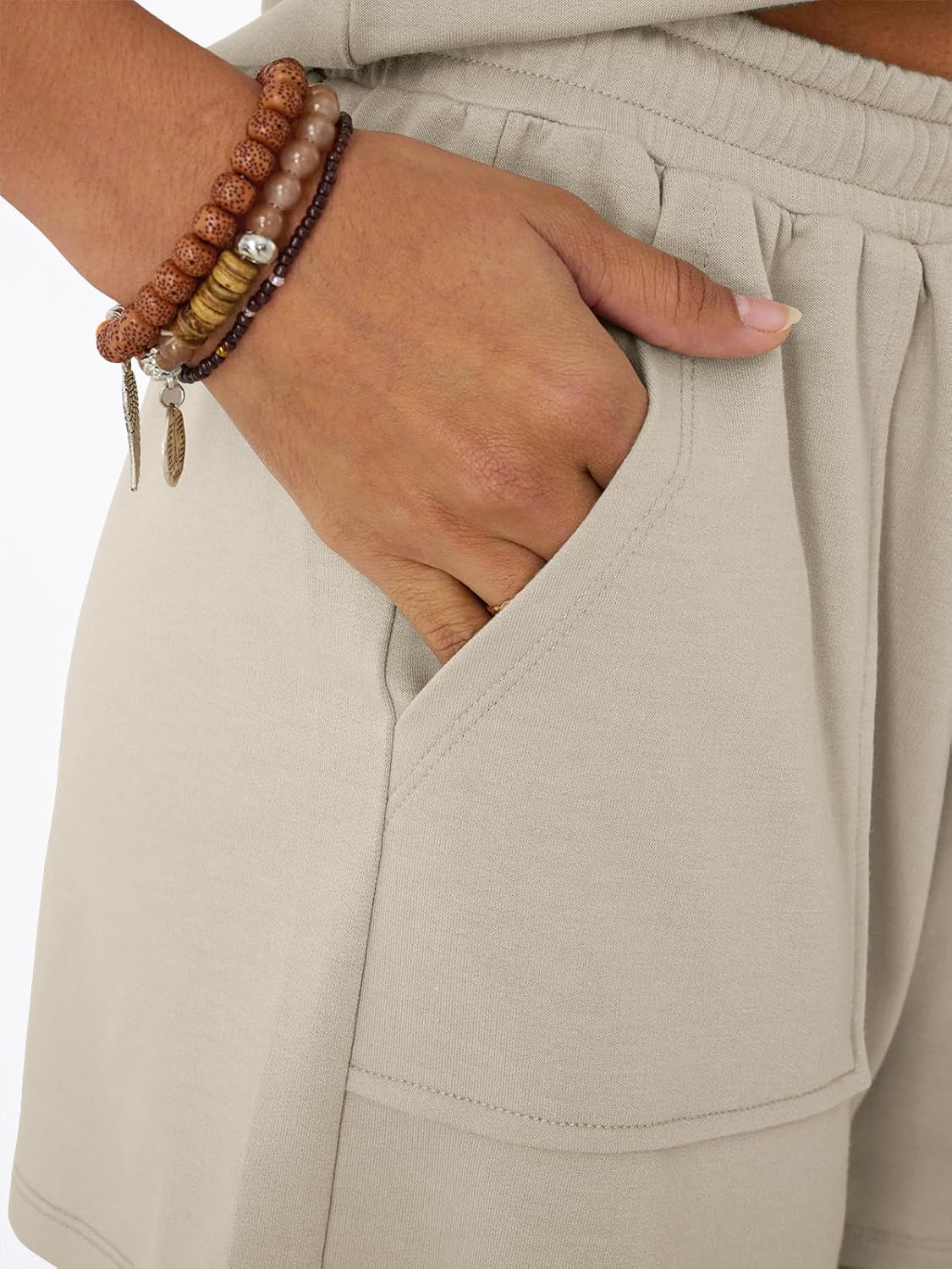 - Features a flattering V-neck cap sleeve top paired with tailored shorts. The clean lines and contrast-stitched pockets add subtle style details, making this set presentable enough to wear outside the house.
